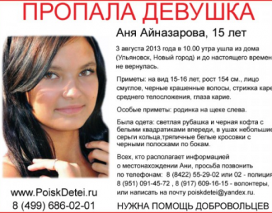 15-летняя Аня Айназарова ушла из дома в новом городе 3 августа 2013 года. Волонтеры, занимающиеся поиском пропавших детей, просят также...