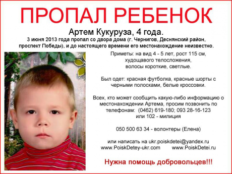 Вечером 4 июня четырехлетний  Артем Кукуруза   был найден без сознания со множественными колотыми и резаными ранами в одной из лесопосадок в  Чернигове.