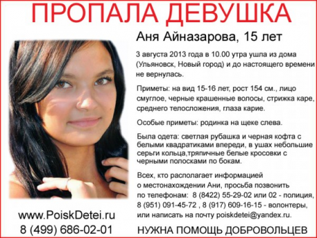 15-летняя Аня Айназарова  ушла из дома в новом городе 3 августа 2013 года.